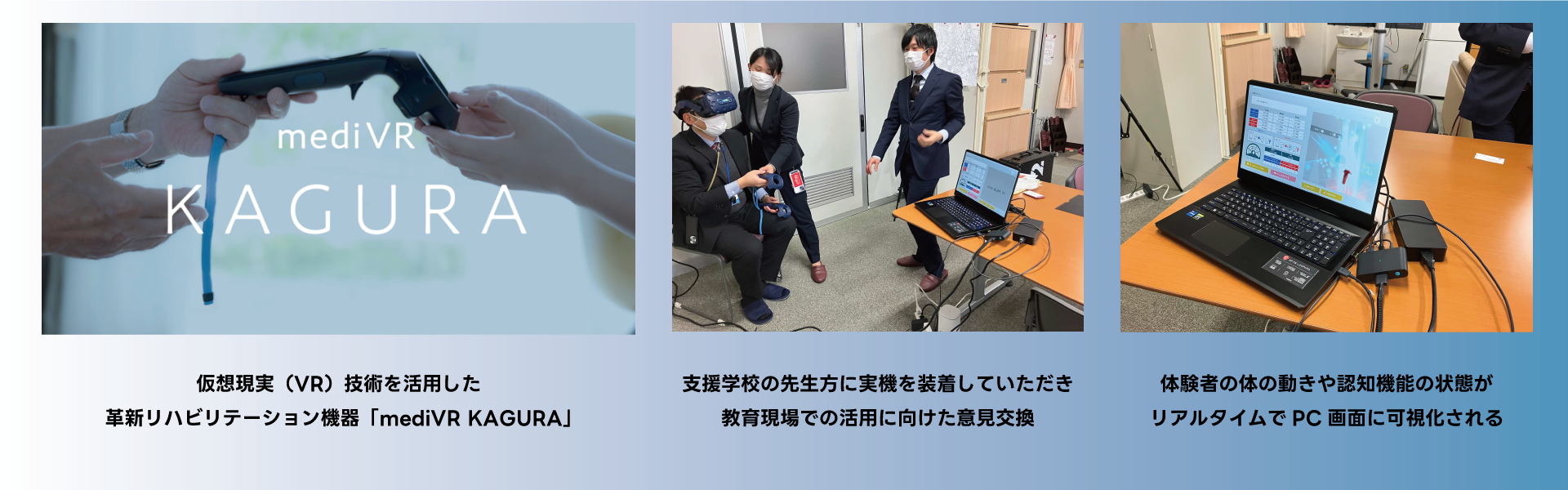 具体的な取り組みとして、堺市内の「上神谷支援学校」を訪問し、教育現場の最前線におられる校長先生をはじめとする担当教員に、実際にVRリハビリの実機(mediVR KAGURA)を装着・体験していただきました。特別支援教育の現場においてどのような活用ニーズがあるのか、そして実際に子どもたちが使用する際の安全性や運用面での課題について、リアルなフィードバックを直接収集しました。