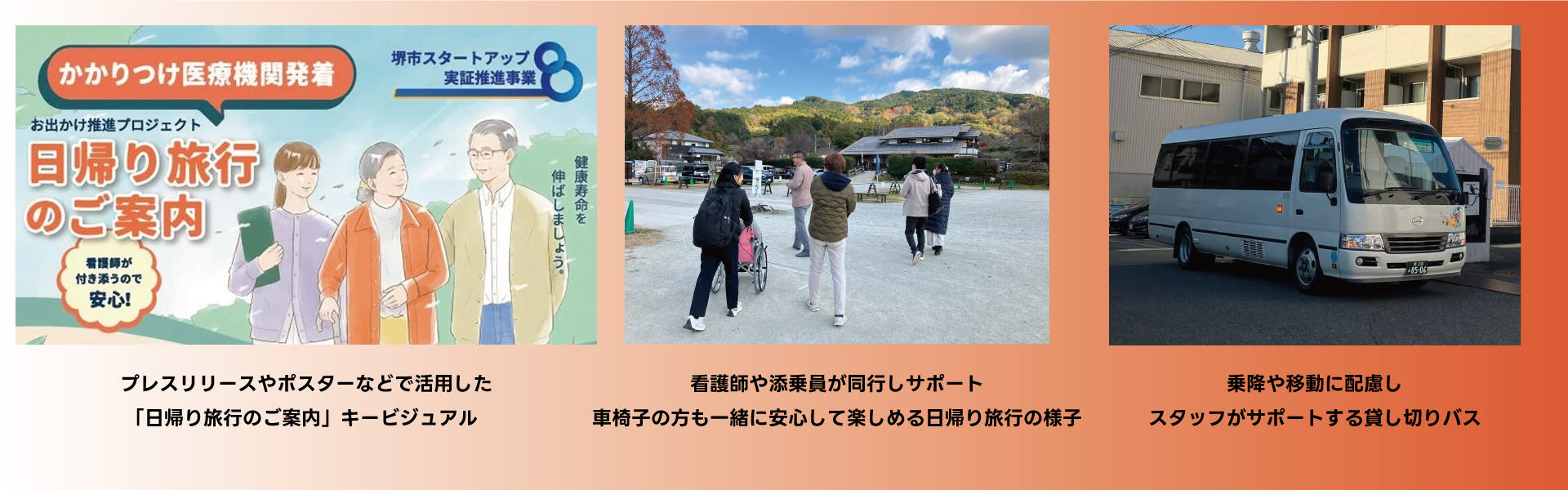 「かかりつけの医療機関までは自力で通院できるが、それ以外の外出機会が少ない」という高齢者を対象に、堺市内の医療機関を発着拠点とした日帰り旅行を実施。旅程管理の有資格者や看護師が同行し、バリアフリーや体力面に配慮した安心の行程を設計することで、高齢者の外出機会の創出と健康寿命の延伸効果を検証するとともに、持続可能なユニバーサルツーリズムのモデル構築をめざす。